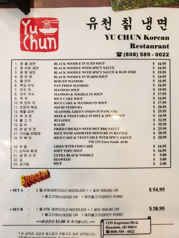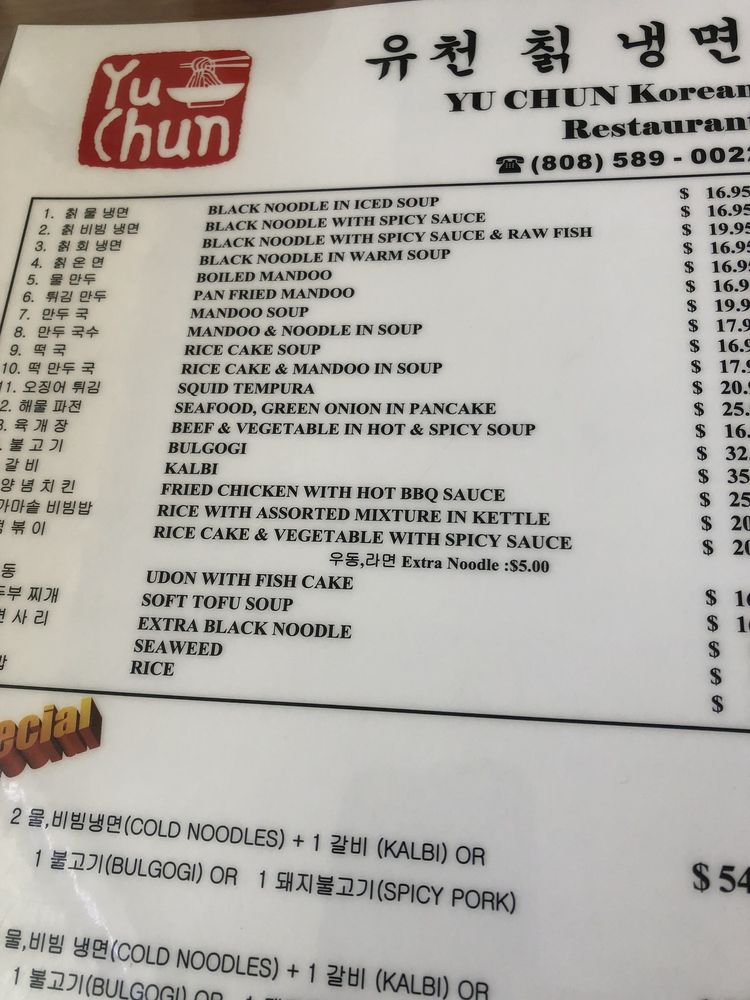 Yu Chun Korean Restaurant, located in Honolulu, specializes in authentic Korean noodles. Their menu features a variety of noodle dishes, including Black Noodle In Iced Soup, Black Noodle With Spicy Sauce, and Rice Cake Soup & Mandoo In Soup. Customers rave about the cold noodles, particularly the mul naengmyeon and bibim naengmyeon options. The kalbi and spicy pork are popular choices for meat pairings, offering flavorful and tender options. The restaurant's ambiance is casual and family-friendly, with options for outdoor seating and catering services. Despite minor complaints about parking and service, Yu Chun Korean Restaurant consistently delivers delicious and refreshing dishes that keep customers coming back. Be sure to try the combination sets for a complete and satisfying meal experience. Overall, Yu Chun Korean Restaurant is a hidden gem for those craving authentic Korean flavors in a cozy setting.